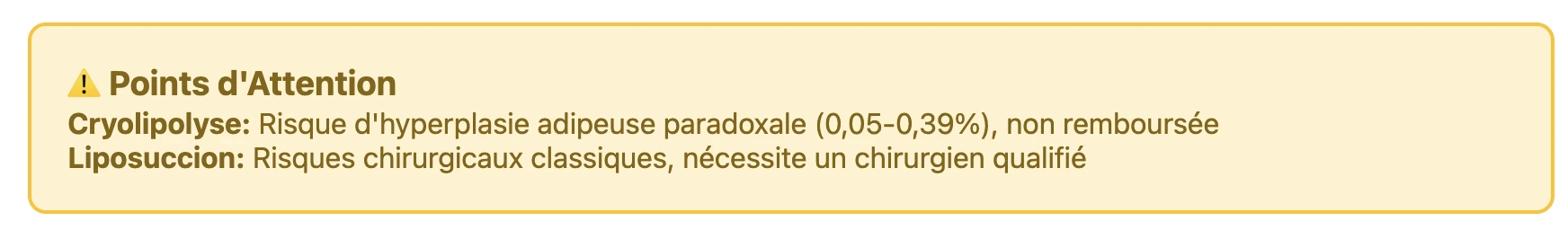 Complication rare mais notable : hyperplasie adipeuse paradoxale (0,05-0,39%), surtout chez les hommes, nécessitant une liposuccion corrective.