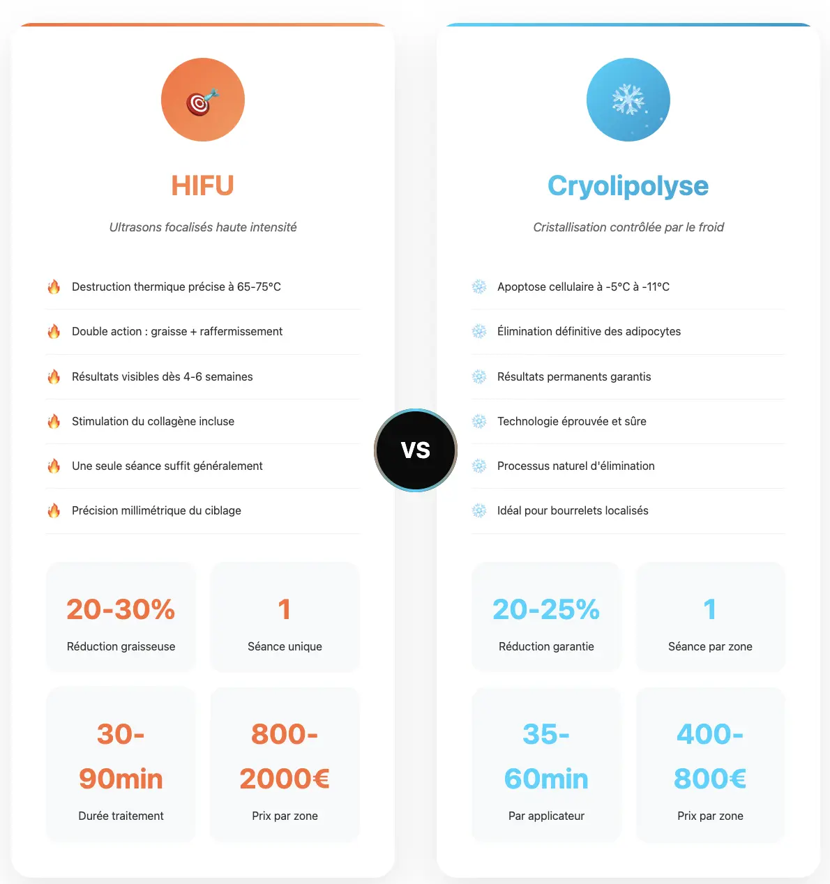 Le HIFU offre une double action (destruction graisseuse et raffermissement) pour une transformation globale, idéale contre le relâchement. La cryolipolyse reste LA référence pour éliminer définitivement les bourrelets localisés avec des résultats permanents et sûrs.